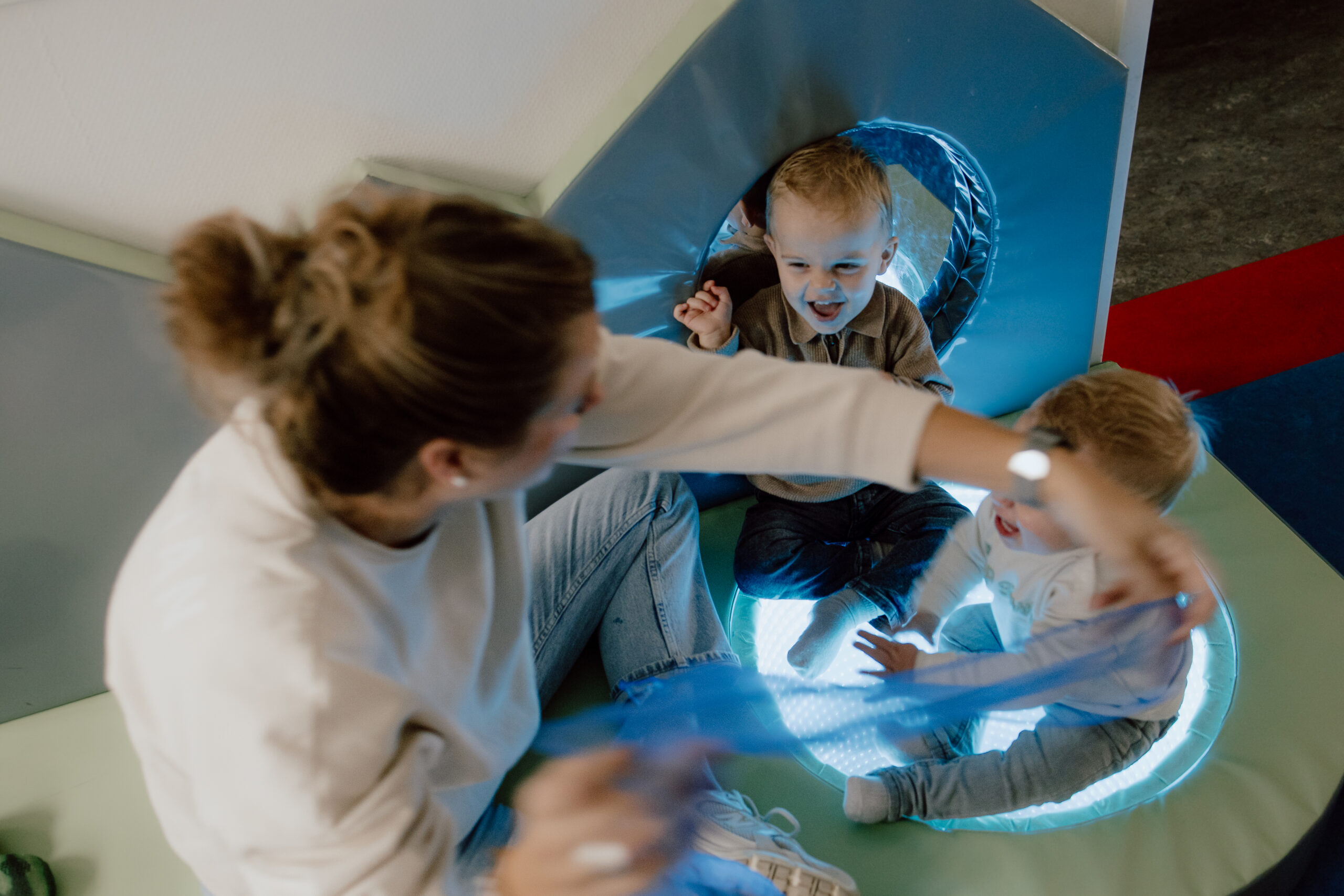 De groepsruimte is ingericht voor jonge kinderen zodat deze veilig en uitdagend is. Bewegen is een van de belangrijkste activiteiten op onze groep; de kinderen leren net lopen, vinden het heerlijk om te kruipen en te klimmen en als ze wat ouder zijn is rennen een interessante uitdaging.